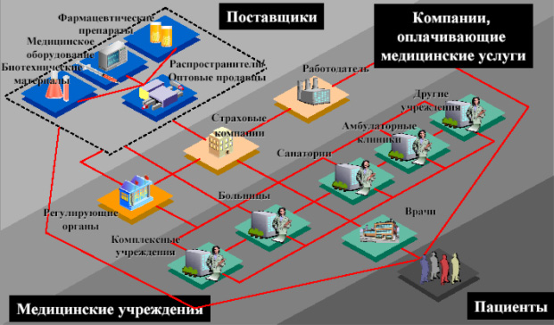 Источник: Microsoft, 2006 Вместе с этим пациенты предъявляют все более высокие требования к качеству медицинской помощи. Общая тенденция к снижению уровня оседлости населения планеты, стирание границ между государствами требует обеспечить постоянный, оперативный доступ к информации о состоянии здоровья каждого гражданина только таким образом можно обеспечить качественное медицинское обслуживание пациента вне зависимости от того, насколько далеко от места постоянного проживания он находится. Рост спроса на медицинские услуги порождает рост их стоимости. Но здравоохранение не должно превращаться в услугу "для богатых". Основная забота государства заключается в том, чтобы сделать медицину доступной всем гражданам страны, что также достижимо с помощью построения системы e-health. Одной из серьезнейших проблем является управление медикаментозным лечением пациентов. Ассортимент лекарств постоянно расширяется, и ни один врач не в состоянии держать в памяти весь перечень препаратов вместе со свойственными им противопоказаниями. По данным ВОЗ, в большинстве западных стран вероятность смерти в больнице от неправильно прописанных лекарств равна 1 из 300. Во Франции расходы на устранение последствий неправильного применения медикаментов составляют более 5 млрд евро в год, что на 60% больше допустимого бюджета. Создание глобальной базы данных о лекарствах, доступной в любом городе мира, поможет хотя бы отчасти решить эту проблему. Комплексная программа организации качественной медицинской помощи должна включать в себя несколько направлений, и внедрение информационных технологий одно из них. Проведенное недавно Rand Corporation исследование показало, что использование современной ИТ-инфраструктуры в здравоохранении могло бы ежегодно экономить до 165 млрд долл. за счет сокращения пребывания пациентов в стационарах, стимулирования своевременного проведения анализов и лечения, а также за счет сокращения административных расходов. Несмотря на то, что среднее значение инвестиций в ИТ в области медицины в настоящее время составляет 2-3% от совокупных расходов на здравоохранение (в то время как, например, в финансовой сфере,этот показатель равен 12-15%), осознание правительствами крупнейших стран необходимости непрерывного финансирования этой отрасли неизбежно приведет к росту расходов на информатизацию медицины. Согласно оценкам компании Gartner, мировые инвестиции в ИТ для здравоохранения в 2006 г. превысят 100 млрд долл., при этом среднегодовой темп роста в период с 2004 по 2009 гг. составит 6,6%, а основные расходы придутся на такие направления, как аутсорсинг бизнес-процессов, ИТ-аутсорсинг, консультационные услуги, создание и интеграция ИТ-ресурсов. Построение системы e-health Программы широкого использования информационных технологий в области здравоохранения (e-health) существуют во многих европейских странах и США. Их реализацию взяли на себя крупнейшие корпорации Oracle, Microsoft, HP, IBM, General Electric и др. По мнению разработчиков этих программ, система e-health должна интегрировать все области здравоохранения страны: и оказание медицинских услуг, и трудовые ресурсы, и управление финансами, и материально-техническое снабжение отрасли для того, чтобы правильно распоряжаться ресурсами. Она должна гарантировать отсутствие дублирования медицинских служб и доступност
